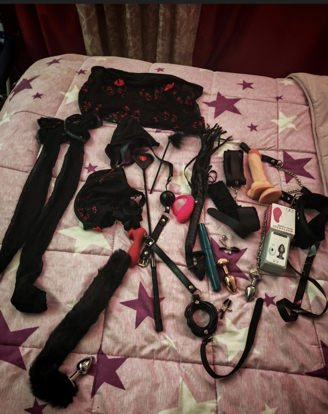 y un sujetador del mismo color, las esposas, la colita de zorra , la bola para la boca y el collar de cuero con su argolla y un antifaz. Y los zapatos de tacón al pie de la cama. Y un papel con un mensaje....”avísame cu