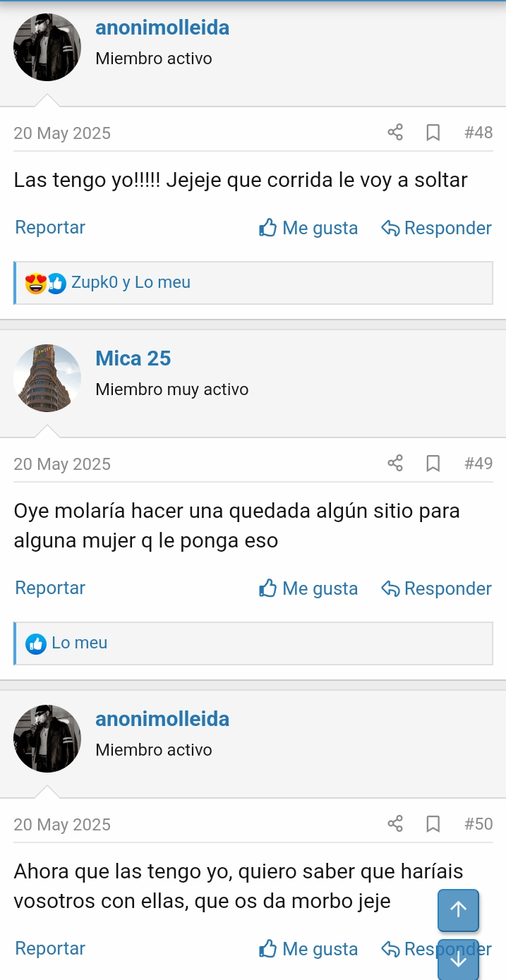 Joer, mira que es la gente, yo no soy ni de cerca ni apenas me incumbe, pero el compañero se ha molestado en crear el hilo, coger las bragas de su mujer usadas, guardarlas para que no pierdan el olor, esconderlas y ponerlo todo en el foro. Algún forero las coge y no tiene los santos cojjones de poner una triste foto de las bragas en su poder, o corridas, o al menos en la mano. Y el pobre que ha creado el hilo sigue poniendo bragas en más sitios por el tema morbo, pero que menos que un poco de reactividad y darle cancha.