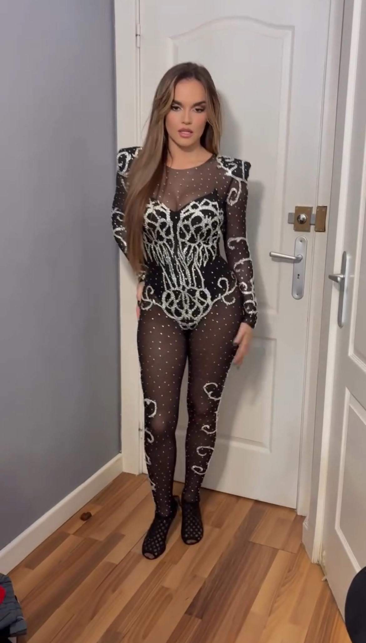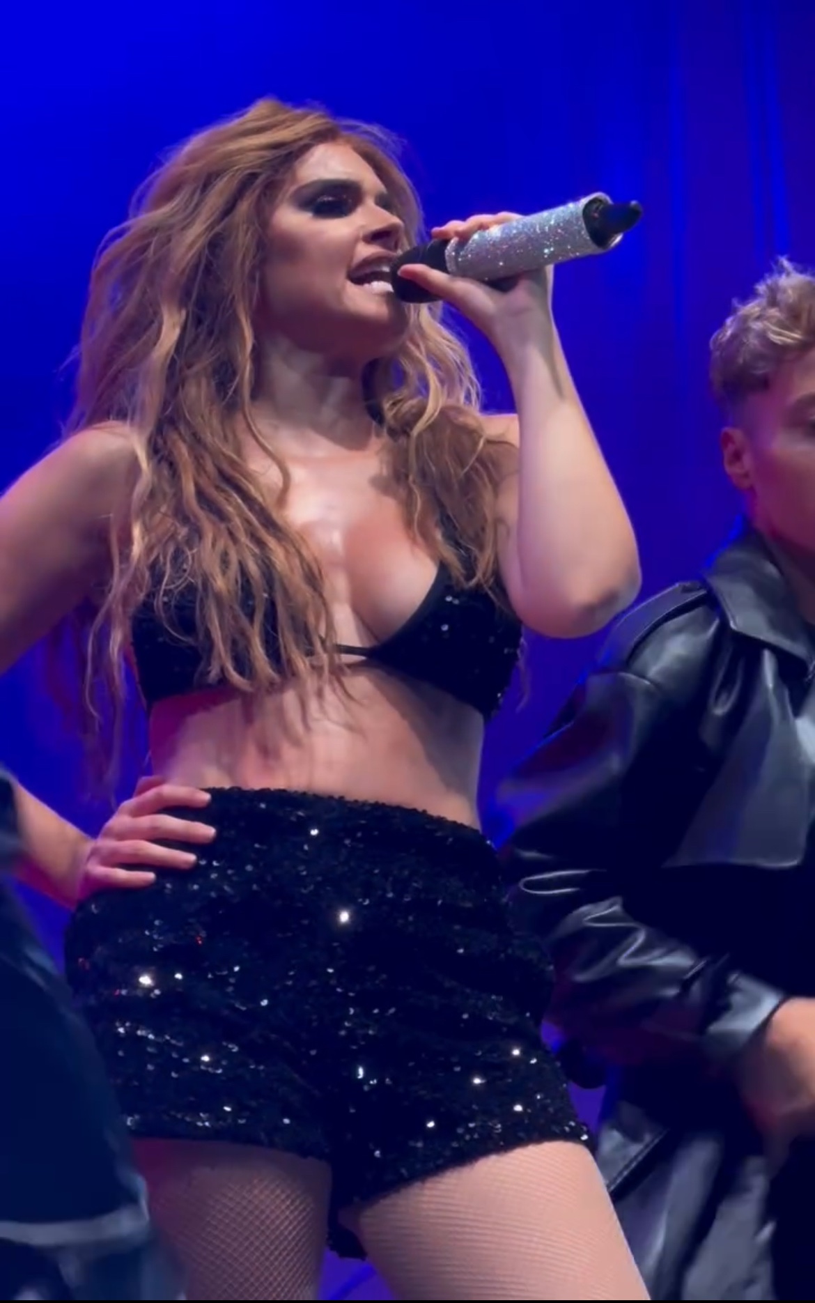 la blusa y queda en brasier negro ,seguro lo hace de aposta y más cuándo Salta como le rebotan esas tetas que hará melody si en un saltó que haga una teta se le logra salir fuera del brasier.