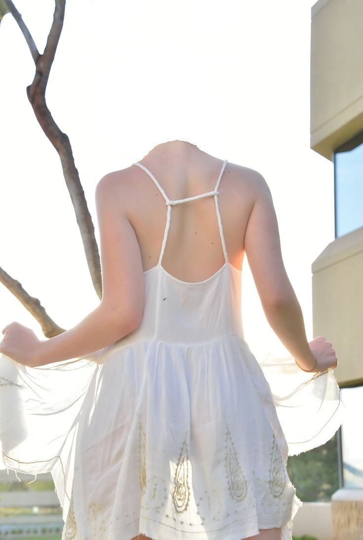 Él la abraza y le quita el lazo que amarraba el vestido en su espalda, abriéndolo y bajándolo por los hombros de ella, quedando desnuda a su merced.