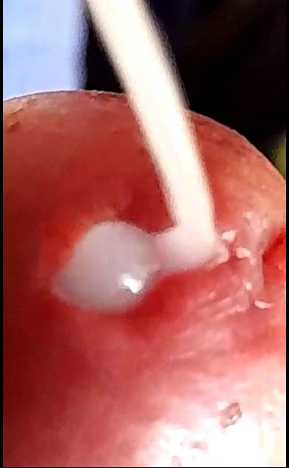 YaA ver que os parece una foto que me quedo de maravilla en la que se ve exactamente el chorro de mi corrida saliendo de la parte de arriba del agujero de la uretra, mientras no entiendo por que en la parte de abajo se queda el semen quieto, sin salir.