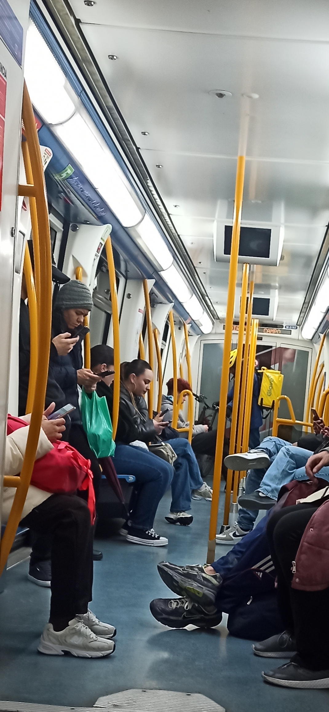 Es una escena que atrapé en un tren. En un principio me llamó la atención el chico, que estaba muy bien, pero luego observé los pies de la otra pasajera así colocados...Como mis dotes de fotógrafa no son muchas y quería hacerlo disimuladamente, la foto no resultó como quería. Pero, bueno, vale para la idea.La calidad en este caso, creo que queda compensada por toda la información que transmite el momento captado. En estos tiempos, creo que por desgracia, se prefiere o al menos, llama la atención más lo virtual que lo real. Este a mi me parece que es un buen ejemplo.