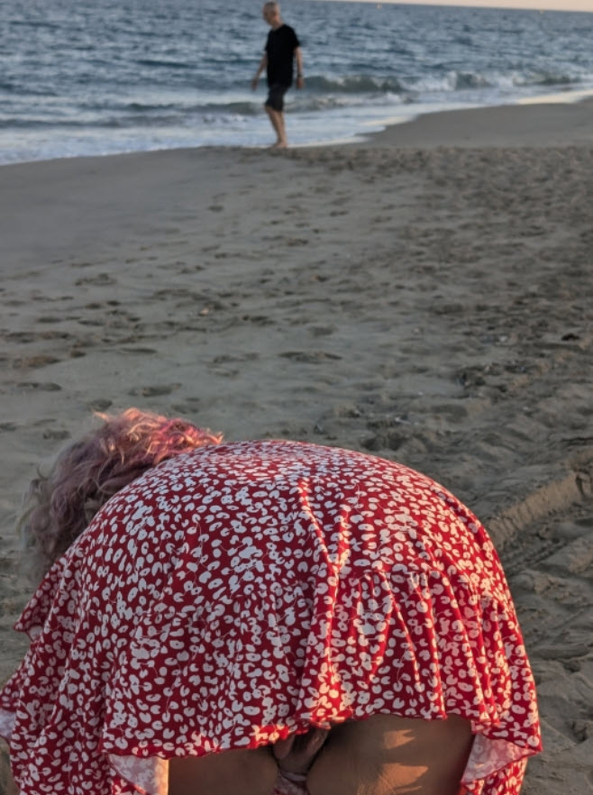 Buff.. Así me gustaría verla recoger la toalla pero con el culo hacia mi.. Que buenas vistas y que abierto se ve ese coño carnosoEn la playa, mi mujer...